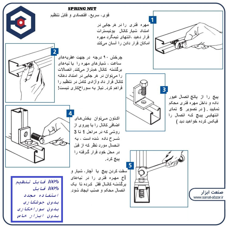 مهره فنری یکی از قطعات کلیدی در سیستمهای ساپورتینگ صنعتی و تأسیساتی است که برای نصب سریع و ایمن تجهیزات روی کانال یونیسترات (STRUT CHANNLE) سیچنل (C-Channel) یا یوچنل (U-Channel) مورد استفاده قرار میگیرد. این مهره به واسطهی طراحی ویژه فنردار خود، به راحتی در داخل ریل قرار گرفته و با یک چرخش ساده، در محل تثبیت میشود.